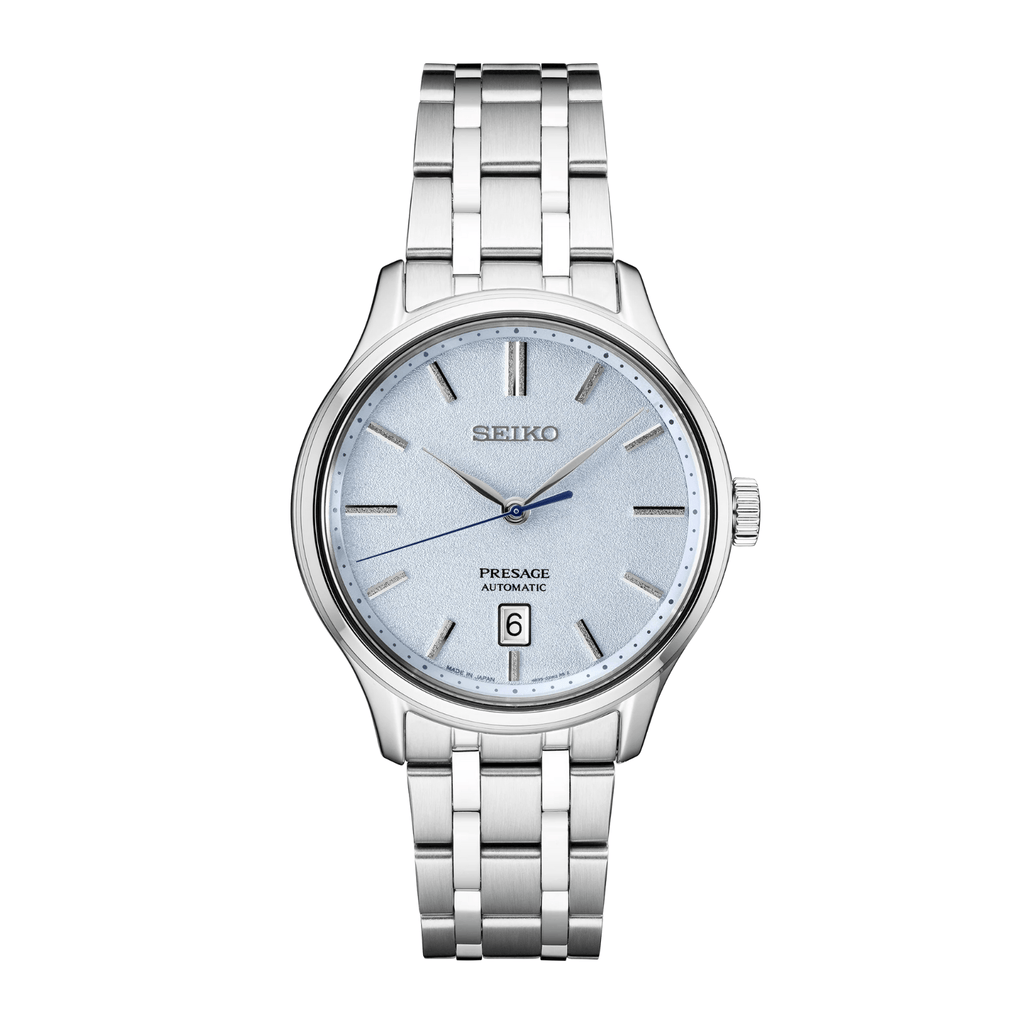 From the Presage Japanese Garden Collection. Offering the finest in Japanese mechanical watchmaking, the Presage Collection blends precision technology with superior craftsmanship and design. From a group inspired by the serenity of a traditional Japanese garden, this elegant US exclusive timepiece features a patterned light blue dial with textured indices evoking stepping stone paths, as well as a dual-curved sapphire crystal, blue second hand, and date calendar. The screwdown see-through caseback provides a view of the 23-jewel movement with manual and automatic winding capability, a frequency of 21,600 vibrations per hour and a power reserve of approximately 41 hours. Crafted of stainless steel, with deployment clasp and push button release. 3 bar, 30M Water Resistant