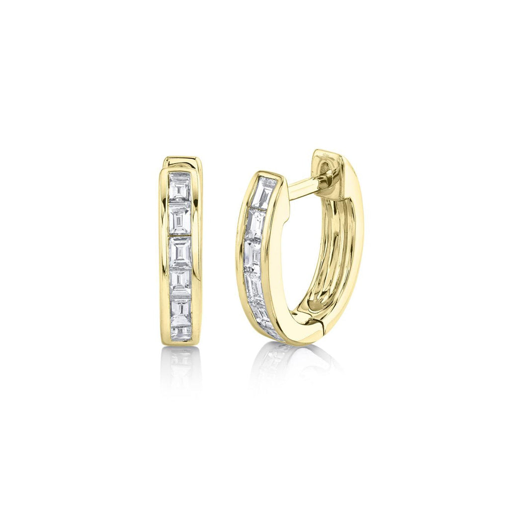 Shy Creation Diamond Baguette Huggie Earrings in 14 karat yellow gold with diamonds totaling 0.33 carats.