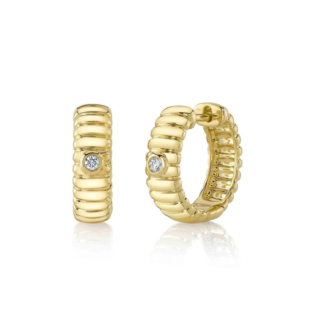 Shy Creation Diamond Bezel Hoop Earrings in 14 karat yellow gold with diamonds totaling 0.05 carat.