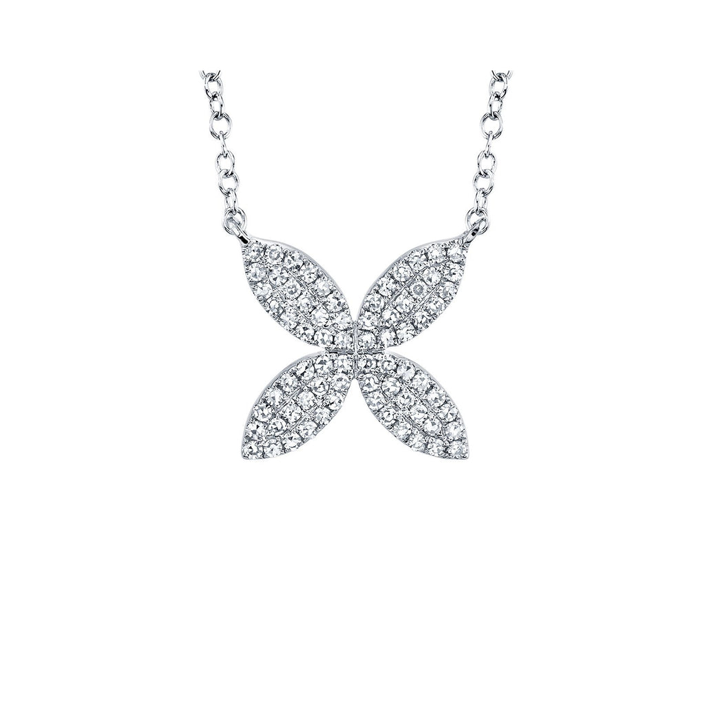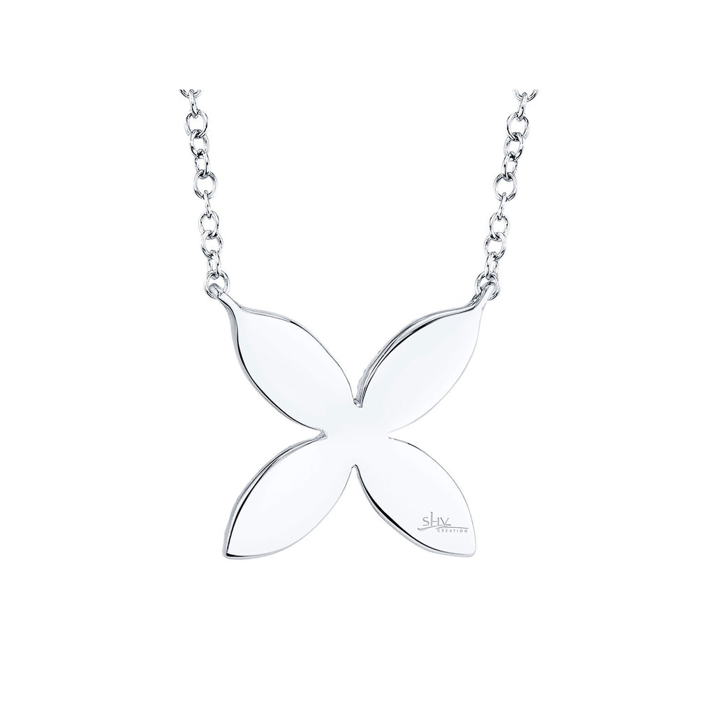 Shy Creation Diamond Flower Necklace in 14 karat white gold with diamonds totaling 0.20 carats.