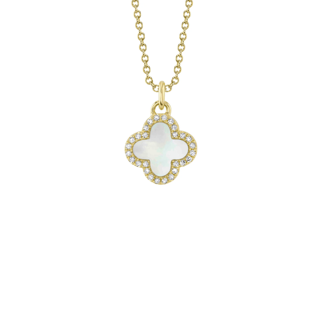 Shy Creation Mother-of-Pearl Clover Necklace in 18 karat yellow gold with mother-of-pearl totaling 0.33 carats.