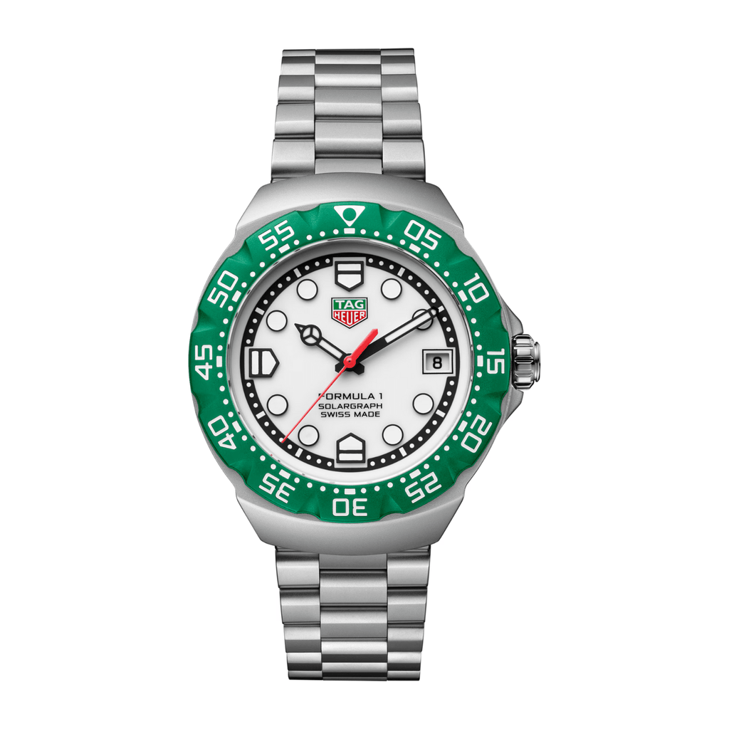 Powered by the in-house Calibre TH50-00, this 38mm TAG Heuer Formula 1 Solargraph channels the brand’s racing heritage into a compact, high-energy design. Inspired by pitlane clocks, the watch’s red, green, and white accents echo the Swiss Maison’s motorsport roots, capturing both color and speed in motion.