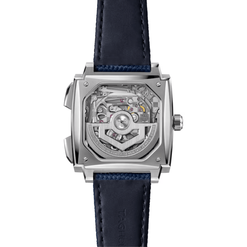 Through the translucent dial, the openworked architecture reveals fine-brushed bridges and blue opaline counters accented in red and white. Super-LumiNova® block indexes and rhodium-plated hands ensure perfect clarity, while the red lacquered chronograph hand adds a vivid racing touch.Featuring a novel approach to the chronograph mechanism with its flexible components, the Calibre TH80-00 offers exceptional reliability. COSC-certified, this movement also integrates TAG Heuer's exclusive TH-Carbonspring oscillator, ensuring superior stability and precision.Crafted in grade 5 titanium, the 40mm case unites resilience with lightness. The sapphire caseback reveals the square calibre’s intricate architecture, while the blue rubber strap with textile embossing and grey stitching combines comfort and elegance. This TAG Heuer Monaco embodies the Maison’s avant-garde spirit—innovative, distinctive, and built to endure.