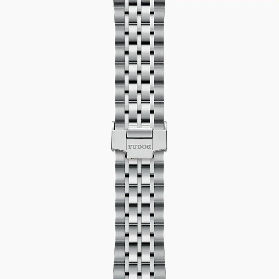 39-mm steel case, silver dial. 39-mm steel case with polished finish. Smooth steel bezel with polished finish. Self-winding mechanical movement, Caliber T601. Silver, embossed decoration, domed. Steel screw-down winding crown with the TUDOR logo. Sapphire crystal. Waterproof to 100 m (330 ft). Steel bracelet, 7 rows, satin-brushed external links, polished center links, with folding clasp and safety catch.