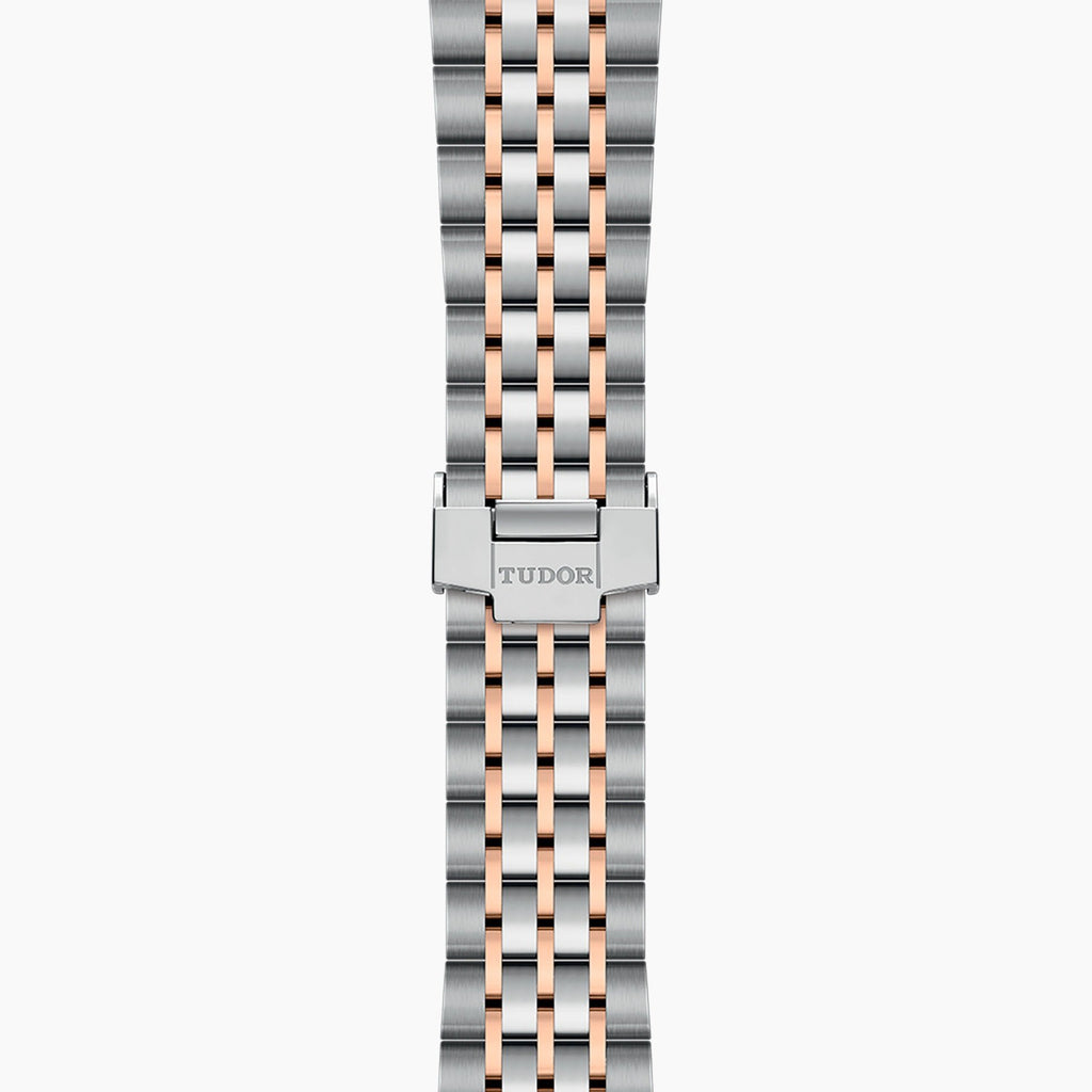 41-mm steel case, pink gold bezel. 41-mm steel case with polished finish. Smooth bezel in rose gold, with polished finish. Self-winding mechanical movement, Caliber T601. Silver, embossed decoration, domed. Steel screw-down winding crown with the TUDOR logo. Sapphire crystal. Waterproof to 100 m (330 ft). Steel and rose gold bracelet, 7 rows, satin-brushed external links, polished center links, with folding clasp and safety catch.