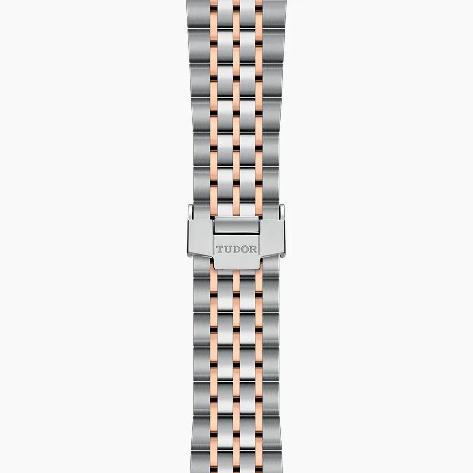 41-mm steel case, diamond-set dial. 41-mm steel case with polished finish. Smooth bezel in rose gold, with polished finish. Self-winding mechanical movement, Caliber T601. Silver, embossed decoration, domed, with 6 diamonds. Steel screw-down winding crown with the TUDOR logo. Sapphire crystal. Waterproof to 100 m (330 ft). Steel and rose gold bracelet, 7 rows, satin-brushed external links, polished center links, with folding clasp and safety catch.