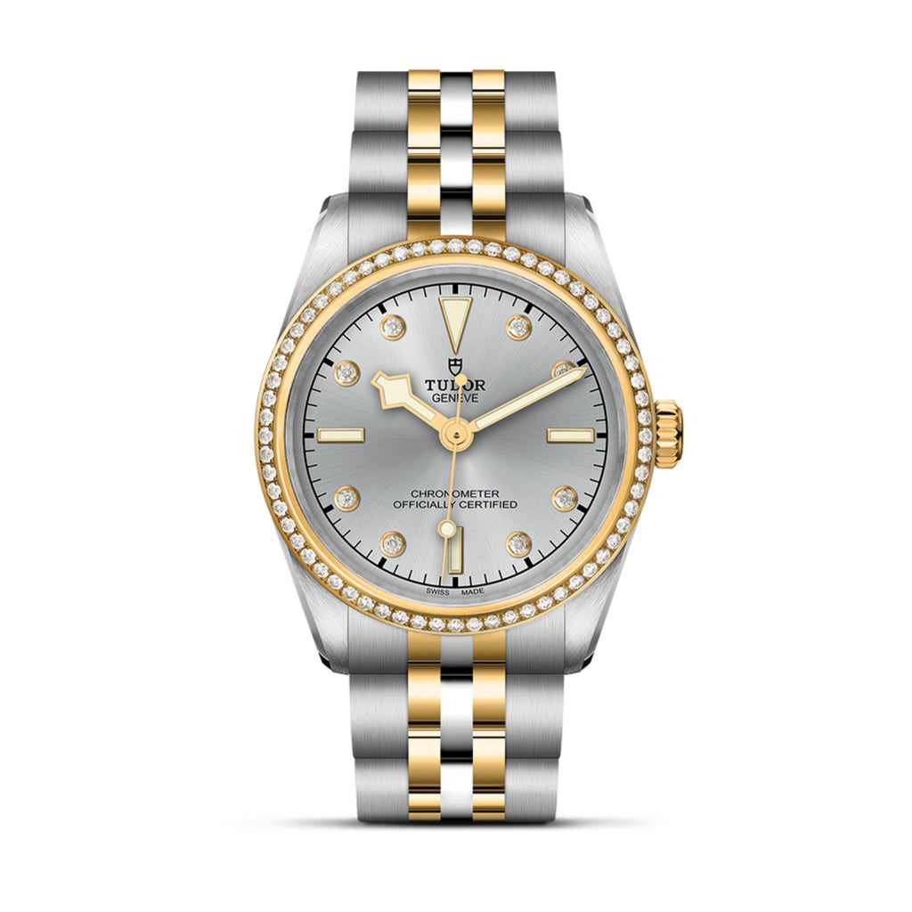 31 mm 316L steel case with polished and satin finish. Fixed bezel in yellow gold set with diamonds. Silver with diamond hour markers. Self-winding mechanical movement with bidirectional rotor system. Power reserve of approximately 50 hours. Waterproof to 100 m (330 ft). Integrated construction. Steel and yellow gold bracelet, polished and satin finish, with steel “T-fit” folding clasp and safety catch. Yellow gold screw-down winding crown with the TUDOR rose in relief
