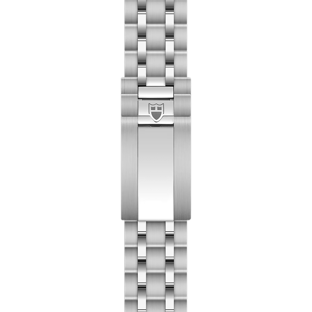 The TUDOR Royal 36mm Steel combines refined elegance with robust engineering. Its 36mm stainless steel case features a harmonious blend of polished and satin finishes, with a slim 9.7mm profile and 9mm lug width for comfortable wear. Powered by the Manufacture Calibre MT5412 movement—COSC-certified and tuned to -2/+4 seconds—this self-winding mechanical watch delivers approximately 70 hours of power reserve. The screw-down winding crown bears the iconic TUDOR logo, while the black dial showcases applied Roman numerals with a date window at 3 o'clock beneath a protective sapphire crystal. Water-resistant to 100 meters, the watch is secured by a 5-link integrated stainless steel bracelet with satin-brushed outer links, polished intermediate links, and a secure folding clasp with safety catch.