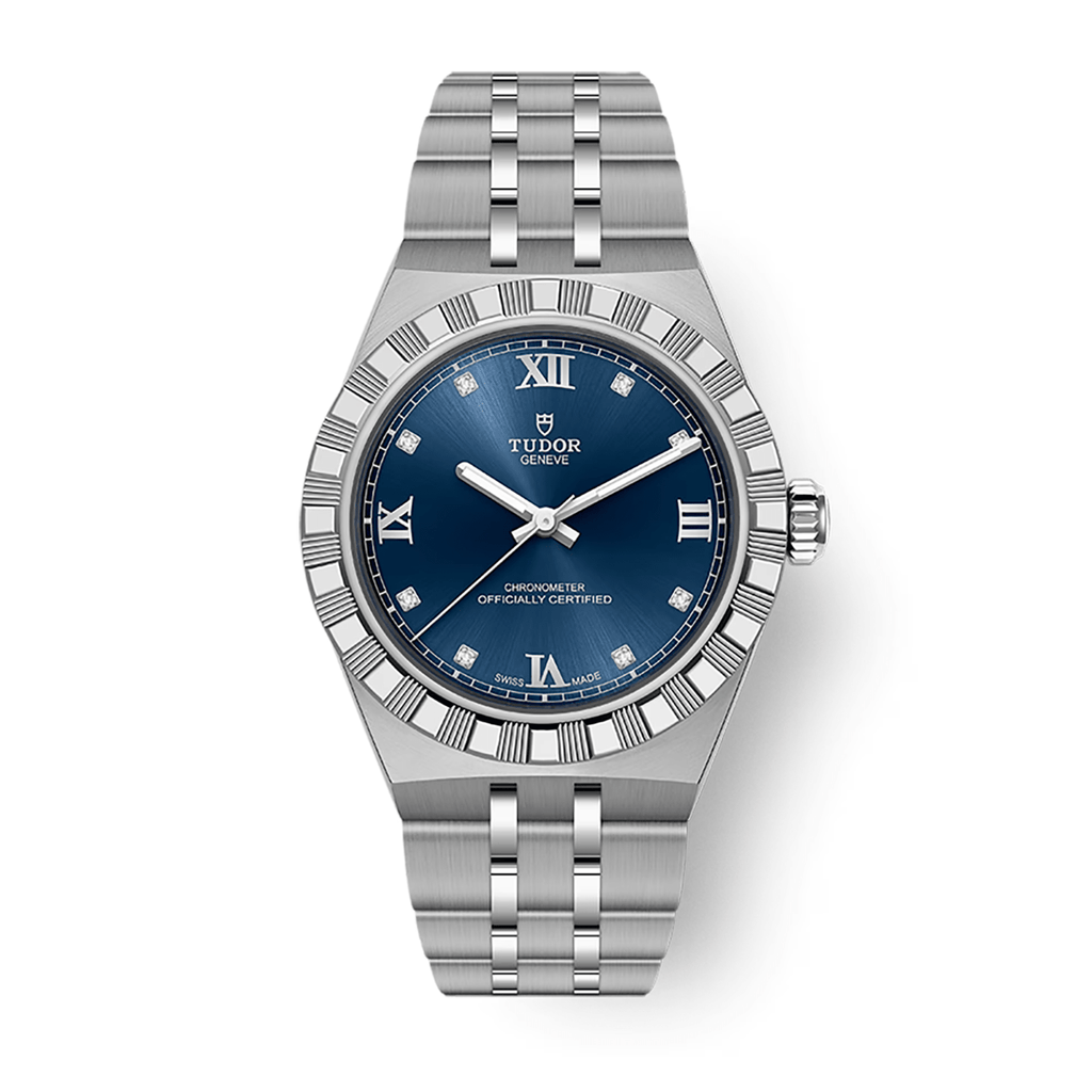 The TUDOR Royal 30mm combines elegant proportions with robust engineering. Its stainless steel case—finished with polished and satin surfaces—measures 8.7mm thick with 7mm lugs. At its heart beats the Manufacture Calibre MT5201, a COSC-certified self-winding movement precise to -3/+5 seconds, offering a generous 50-hour power reserve. The screw-down crown displays the TUDOR logo in relief, while the sapphire crystal guards a captivating blue dial adorned with applied Roman numerals. Built for durability, the watch is water-resistant to 100m and secured by a 5-link integrated stainless steel bracelet featuring satin-brushed outer and central links with polished intermediate links, completed by a folding clasp with safety catch.