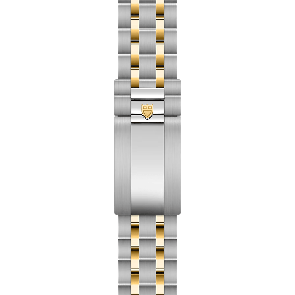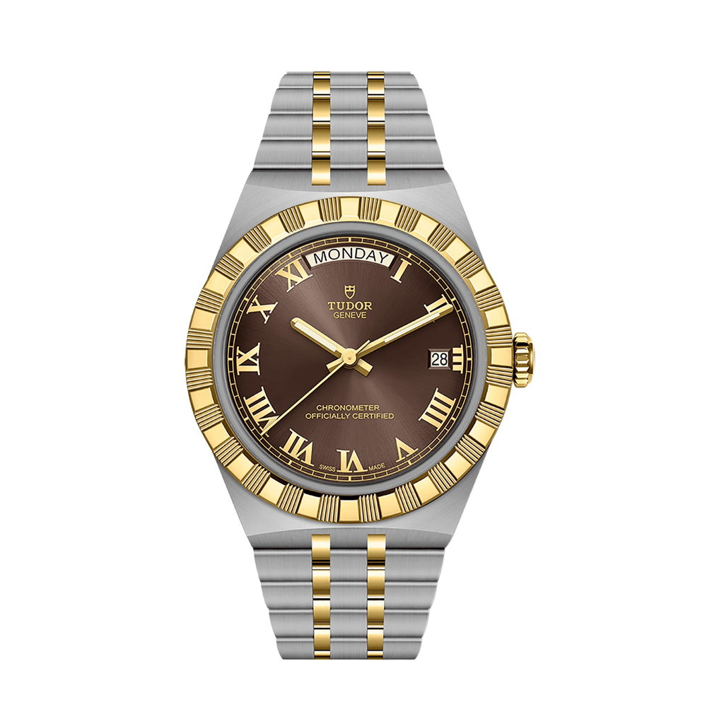 The TUDOR Royal 40mm Steel combines classic elegance with robust engineering. Its 40mm stainless steel case features a refined polished and satin finish, housing the reliable Manufacture Calibre MT5633 movement—a COSC-certified self-winding mechanism tuned to -2/+4 seconds with an impressive 70-hour power reserve. The screw-down winding crown bears the iconic TUDOR logo, while the sapphire crystal protects a silver dial with applied stick hour markers, date window at 3 o'clock, and day display at 12 o'clock. Water-resistant to 100 meters, this timepiece is built for everyday wear. The integrated 5-link stainless steel bracelet features satin-brushed external and central links contrasted with polished intermediate links, secured by a folding clasp with safety catch. At just 11.4mm thick with 9mm lugs, it offers a refined fit for any wrist.