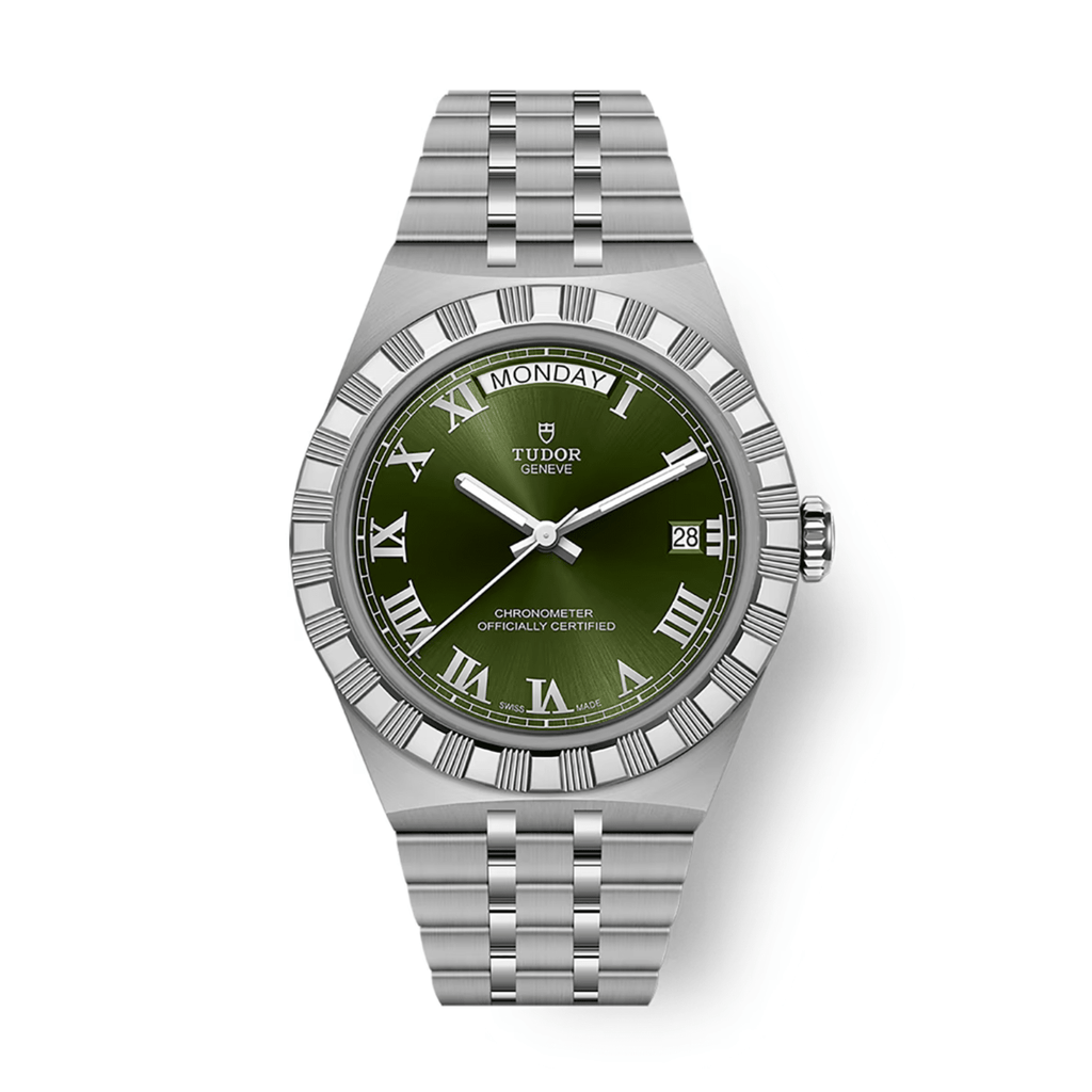 The TUDOR Royal 40mm Steel combines classic style with reliable performance. Its 40mm stainless steel case features polished and satin finishes, while the green dial displays Roman numerals, date, and day. The COSC-certified Manufacture Calibre MT5633 movement keeps accurate time with a 70-hour power reserve. The screw-down crown with TUDOR logo and sapphire crystal ensure durability, while the integrated 5-link stainless steel bracelet offers comfort and security. Water-resistant to 100m (330 ft), it's ready for everyday wear. Backed by a five-year transferable warranty with no registration needed, this is a timepiece built to last.