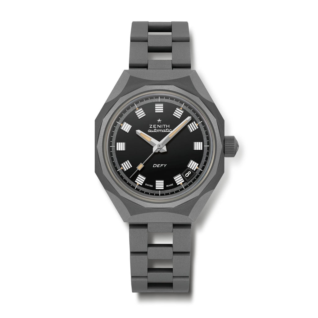 Shadow version (Microblasted titanium) of the original DEFY Octogonal case with iconic 14-sided bezel. Elite 670, Automatic movement. Frequency 28,800 VpH (4 Hz) Power reserve approx. 50 hours. Hours and minutes in the centre. Central seconds hand. Date indication at 4:30. New star-shaped oscillating weight with satined finishings. 37mm Microblasted titanium case, black dial. Water resistance: 30 ATM. Rhodium-plated, faceted. Rhodium-plated, faceted and coated with Beige SuperLuminova. Bracelet & Buckle: Micoblasted titanium "Ladder" bracelet